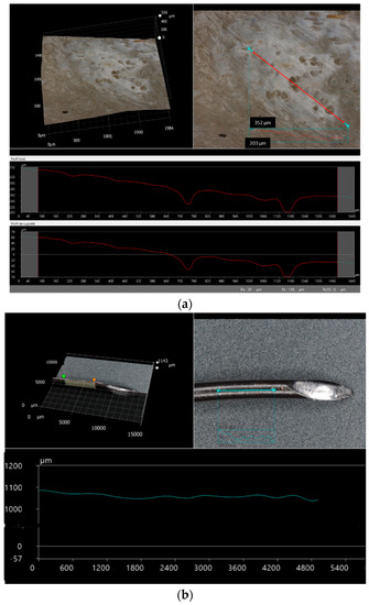 The presence of surface porosity is thus highlighted close to these areas, which seems to be genuine to the filament production process. The porosity average size is of the order of 60 µm based on the roughness profiles recorded from the surface. This porosity can be explained by the lack of cohesion between PLA matrix and flax fibres. Besides the presence of the porosity, there is a wide variation in surface waviness, which indicates a possible effect of flax fibre filling irregularly the filament core. Figure 8b shows an opposite situation for PLA filament where flatness of the surface demonstrates the absence of surface porosity and a regular filament shape.