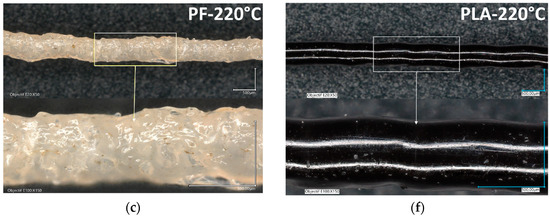 Filament morphology of PLA and PF after extrusion at high temperatures. (a–c) PF filament at 200 °C, 210 °C et 220 °C, respectively. (d–f) PLA after extrusion at the same extrusion temperatures.