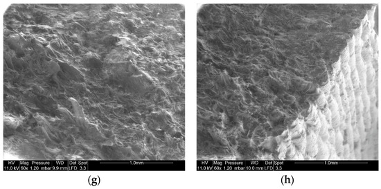 SEM micrographs showing the differences in microstructural arrangement between PLA and PF printed samples. (a) PLA printed at 200 °C layup view, (b) PLA printed at 200 °C edge view, (c) PLA printed at 210 °C layup view, (d) PLA printed at 210 °C edge view, (e) PF printed at 200 °C layup view, (f) PF printed at 200 °C edge view, (g) PF printed at 210 °C layup view, and (h) PF printed at 210 °C edge view.