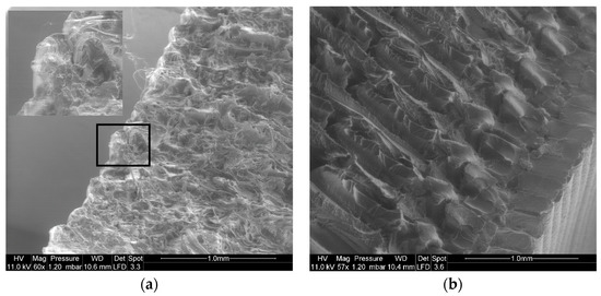 Figure 11 shows SEM micrographs of PLA and PF printed structures proving that the morphology of the core and the surface roughness of the printed materials are both affected in different ways. In the case of PF (Figure 10a), the observed fractured surfaces do not allow distinguishing the layups as the topography of the exposed surface is rough with pulled out flax fibres. In addition, the layering of the structure visible at the edge of the specimen seems jagged although the average layer height is almost constant. The surface rough aspect of the PF 3D printed material can be an additional factor against improvement of ultimate performance as the surface defects can act as stress concentrators and induce instable cracking. For the case of PLA (Figure 10b), the −45°/+45° layups are noticeable even if the stretching of individual filament alter the smooth aspect of the fractured surface. Additionally, the topography of the top surface shows a regular layer height and a smooth aspect of the two-filament thick external frame. This smooth morphology helps to keep a higher elongation at break as shown in a previous work [25].