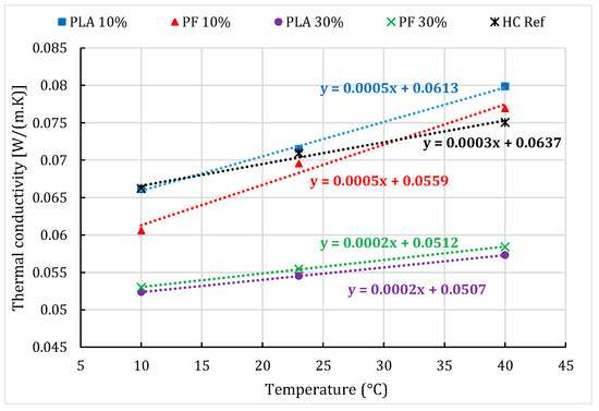 The results of thermal conductivity at three imposed temperatures (10 °C, 23 °C, and 40 °C) are shown in Figure 12 for printed PLA and PF at two infill levels (10% and 30%).