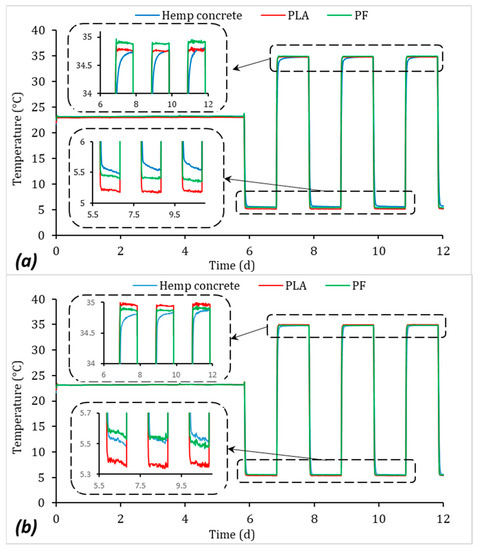 The experimental conditions corresponding to an infill of 10% are selected as a candidate condition that offers a good compromise between material consumption and isolation performance (with respect to hemp concrete according to Figure 12). The results of thermal and humidity cycling in the climatic chamber of both PL and PF printed at 200 °C with an infill of 10% are shown in Figure 13 and Figure 14 for the two considered depths. The temperature results collected from the sensors are shown in Figure 13. The temperature variations at the two depths during the cycling are almost the same for PLA and PF. The temperature responses recorded follow closely the climatic chamber excitation (Figure 13). This result can be explained by a rapid thermal kinetics compared to hemp concrete. However, deviations can be observed on the temperature amplitudes between PLA and PF. If sensor uncertainty and/or contact thermal resistance at the drilled positions are neglected, even these small variations indicate thermal exchange more important for PF than PLA. This result might be surprising knowing the thermal insulation of natural fibres. These changes can be also interpreted in terms of water uptake and possible modification of the thermal properties of flax fibres. However, another explanation can be related to the role of defects especially the presence of intra-filament porosity revealed as main difference between PLA and PF by SEM (Figure 10). The differences lead to a more permeable cell wall in PF in comparison to PLA and thus to higher thermal conductivity.