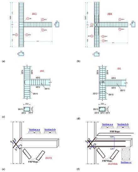 Geometry and steel reinforcement for the specimens (dimensions in mm): (a) JA1, (b) JBX, (c) JA0, (d) JB1, (e) JB1FX, (f) JA1FXb.
