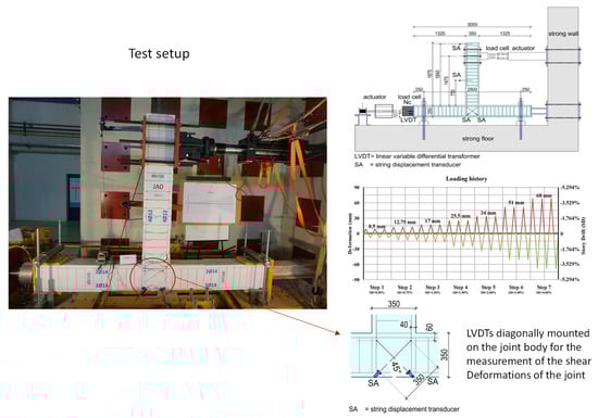 Test setup and the applied loading history are presented in Figure 2 [26,27]. Deformations of the specimen are presented in terms of Story Drift (SD). In general, the term drift represents the ratio between the imposed displacement and the beam length from the loaded end to the column centerline [27,34,35]. In the tested specimens drift is calculated based on the observed deformation Δℓ at each loading step as follows: