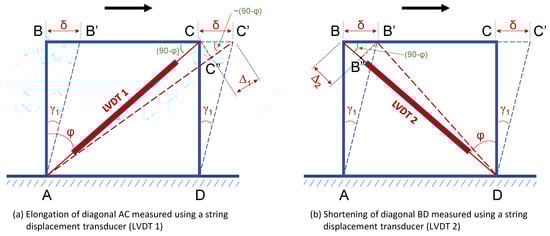 From the elongation Δ1 of diagonal AC as measured by LVDT1 (Figure 3a) the shear deformation is extracted. It is equal to γ1 = δ/h1 where h1 = L1cosφ1 and L1 is the length of the diagonal string LVDT1, and from the orthogonal triangle CC′C″ it can be deduced that
