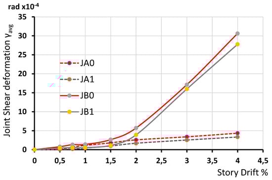 In Figure 5 the influence of the X-shaped steel reinforcement of the joint (specimen JB0X) on the shear deformations of the joint is studied. Comparative presentation of the observed joint shear deformations of specimens JB0 and JB0X can be shown in Figure 5. The strong influence of the X-shape steel reinforcement placed in the joint body of the specimen JB0X is apparent. In high story drifts (2–4%) the diagonal steel reinforcement kept the joint body intact and efficiently reduced the shear deformations compared to the shear deformations developed in reference specimen JB0 without the diagonal steel reinforcement.