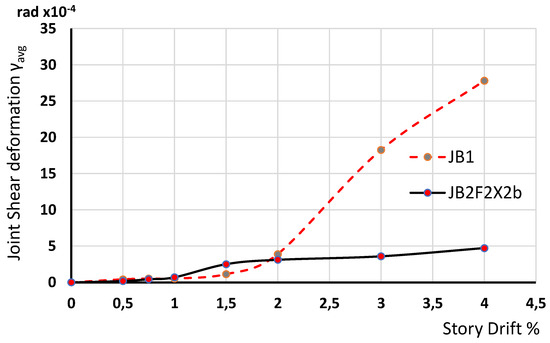 Comparative presentation of the observed joint shear deformations of specimens JB1 with specimen JB2F2X2b is presented in Figure 9. Thereupon, the ratios of the measured shear deformations of the strengthened specimen JB2F2X2b over the shear deformations of the reference unstrengthened specimen JB1 were 0.18, 0.17, 0.24 and 0.24 for the drifts 1.5%, 2.0, 3.0 and 4.0, respectively. In this case the externally mounted C-FRP ropes kept the joint body and part of the beam of JB2F2X2b almost intact throughout the testing procedure and efficiently reduced the shear deformations.