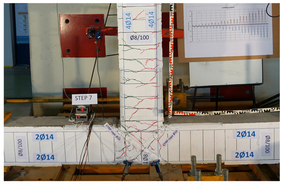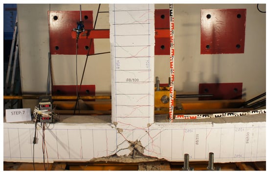 The maximum shear force enforced in the joint by the 4 bars (14 mm diameter) of the tensile reinforcement of the beam is Vjhd = 320 kN and therefrom the shear stress is τ = 3.67 MPa. Further, it is calculated that for the specimens holds ΣMc/MRb = 1.43. According to ACI 318 external joints have to satisfy the relationship ΣMc/MRb > 1.40. Thereunder cracks are expected in the beam but since ΣMc/MRb = 1.43 is almost equal to the critical value 1.40 cracks and damage are also expected in the joint body.