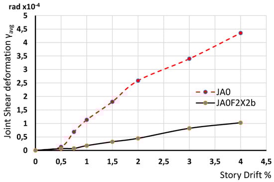 Comparative presentation of the observed joint shear deformations of specimens JA0 and JA0F2X2b is shown in Figure 10. Both specimens belong to group A and in both cases the joint body remained intact during the test. Nevertheless, even in this comparison it is observed (Figure 10) that the externally mounted C-FRP ropes of specimen JA0F2x2b substantially reduced the shear deformations.