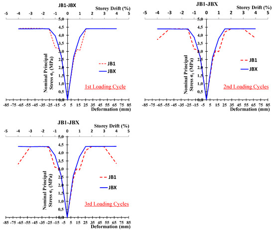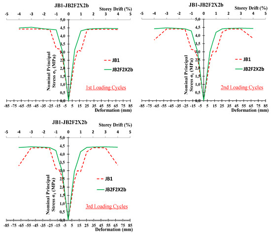 Finally, in Figure 13 the principal stresses of specimen JB2F2X2b developed during the 1st, 2nd and 3rd loading cycle of each loading step are presented. These stresses are compared with the corresponding ones of the unstrengthened reference specimen JB1. The influence of the X-shape C-FRP ropes mounted on both sides of the joint body and the beam proved to be very important. In 2nd and 3rd loading cycles and especially in high story drifts (3–4%) the external strengthening reinforcement kept the joint body almost intact and the values of the principal stresses remained high compared to the ones of reference specimen JB1. These observations indicate that the externally applied strengthening C-FRP ropes kept the joint body of the JB2F2X2b intact whereas the joint body of the JB1 severely damaged.
