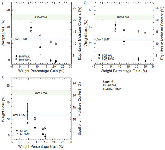 Effects of two different alkylene oxides and one anhydride modification on the weight loss (WL, left-y axis) and equilibrium moisture content (EMC, y-right axis) at 90% RH and 27 °C for wood fibers modified with (a) butylene oxide (BOF), and (b) propylene oxide (POF), (c) acetic anhydride (AF). EMC measurements were performed with six replicates, WPG were calculated from triplicates, and WL measurements had 5 replicates. Data points correspond to the mean values and the error bars are the standard deviations.