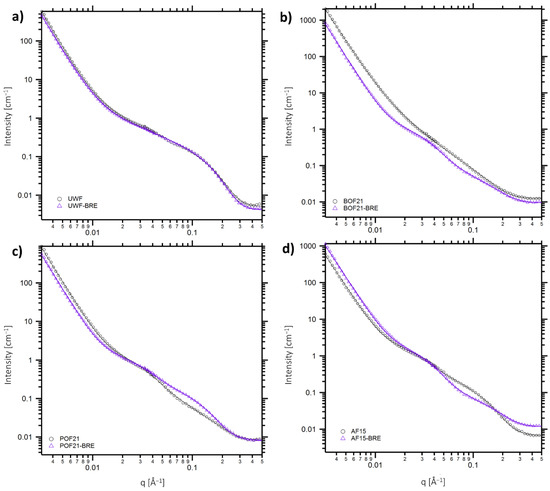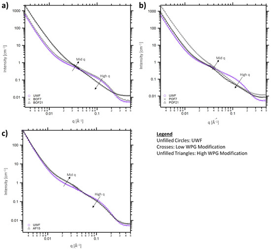 By fitting the SANS data with a Unified Fit model with three structural levels, we can quantify the differences observed in the mid-q and high-q regions in terms of their associated power law and/or characteristic dimension Rg, which are listed in Table 5. Chemical modification did not change the low-q power law scattering exponent, which was close to ~4 for all samples, indicating scatterings from relatively smooth surfaces of large objects are dominating this region. Thus, the power law exponent was fixed at four for subsequent analysis for most samples. In the mid-q region, the cross-section of the microfibrils, whose mean diameter is about 20 nm [15,29,30,31], as well as hydrophobic nanodomains in the wood polymer matrix can contribute to the scattering intensity. The unmodified fibers and BO-modified fibers only showed power law scattering with exponents ranging between ~1 to ~1.5. This behavior is likely caused by the strong contribution of the scattering from the long cellulose fibrils. For PO- and AA-modified fibers, the most pronounced change is the emergence of a new characteristic length scale in the mid-q region that is shown as a shoulder around q ~0.025 Å−1 in Figure 2b,c. The size of this feature is larger in the AF sample than in the POF samples, and the underlying power law is also different between these two modifications. These differences may be in part attributed to the differences observed in the high-q region. For the AF sample, the scattering from the elementary fibrils is stronger and their Rg is larger than the one observed for unmodified fiber (Supplementary Figures S1 and S2). Conversely, for PO fibers, the scattering contribution from the elementary fibrils is reduced, which increases the uncertainty in the measured Rg value (Supplementary Figure S3).