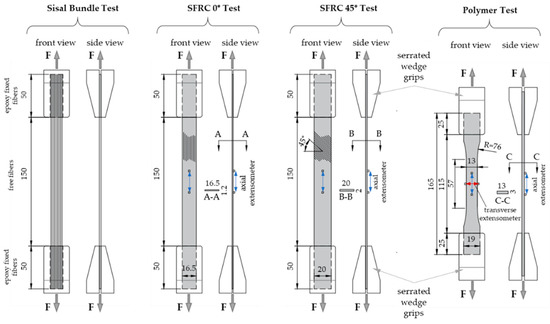 Tests for measuring the fiber properties, epoxy properties and the effective properties of the SFRC were carried out on a Shimadzu Autograph AGS-X testing machine [49] with load capacity from 1 kN to 10 kN, giving display force accuracy within ±0.5%. The testing system includes an external sensor amplifier ESA-CU200 and material data-processing software TRAPEZIUM X. Strain measurements were carried out with axial and transverse extensometers, products of Epsilon technology corp. (Jackson, WY, USA) [50]. A schematic description of tensile testing for fiber bundles, SFRC specimens with axial load, SFRC specimens with 45° off-axis load and for polymer matrix specimens is shown in Figure 2.