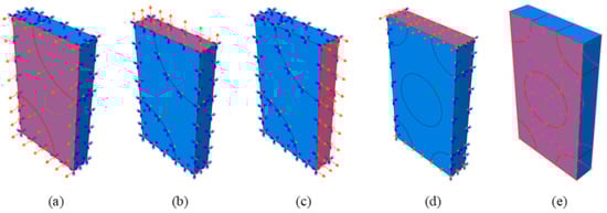 In accordance with both approaches, numerical micromechanical models utilizing the RVE [36] are used. For this, unit cell models were developed in the FEA software ABAQUS [51]. The Abaqus/Standard [52] analysis of static linear perturbations is carried out with applied unit strain in the x, y, z directions and unit shear strain along the fiber direction. Because the model is periodic, symmetry boundary conditions apply to planes that are not subject to displacement (Figure 3a–c). In the case of shear deformation, the plane transverse to the fiber is not a plane of symmetry; coupling-constraint boundary conditions are set for these surfaces (Figure 3d,e). The numerical models use an element type of C3D8R (8-node linear block, reduced integration) [53].