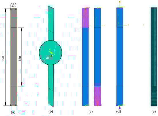FEA model: geometry (a), 0° fiber orientation (b), boundary conditions (c,d), meshing (e).