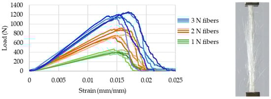 A total of 15 tensile tests were performed on different sisal-fiber bundles: five for each bundle group, which contained different quantitative content of the fibers. During the loading, at first the fibers were stretched, then some of the fibers began to break before the load reached the maximum measured value; the bulk of the fibers broke after this in the strain range of 1.5–2%, and only some of the fibers reached a strain of 2.5% (Figure 5). The critical value of the load increased with an increase in the number of fibers: the 44, 88 and 132 g specimen bundles, on average, withstood 419, 807 and 1197 N, respectively. Thus, with an increase in the number of fibers, the load-bearing capacity also grew close to a linear relationship. In general, the longitudinal elastic modulus varied from 22.5 GPa to 29.6 GPa; it is worth noting that the difference between the maximum and minimum values for each test group decreased with an increase in the number of fibers. The standard deviation of the elastic modulus decreased from 2.4 GPa to 1.5 GPa with a threefold increase in the number of fibers. Nevertheless, the average value of the elastic modulus for each group was almost the same and close to 25 GPa, which corresponds to the obtained value of the modulus of elasticity in the study of Oksman et al [11].