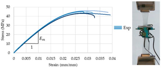 The tensile behavior of the epoxy resin is nonlinear and corresponds to the typical behavior of plastics. The average value of tensile strength at yield point is at a strain of 2.8%. The modulus of elasticity was measured at the initial segment of the curve, which is close to linear, as shown in Figure 6. The obtained modulus of elasticity is ; the Poisson’s ratio is .