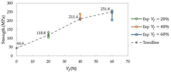 SFRC tensile tests with axial load were performed on three series of samples with fiber-volume fractions of 20%, 40% and 60%. At least five samples were tested for each fiber-volume fraction. For the 20% fiber-volume fraction, the typical fracture mode is close in shape to that of a homogeneous material—an almost straight line perpendicular to the load direction (Figure 7a). For a 60% fiber-volume fraction, the fracture takes the form of vertical stripes parallel to the fiber direction (Figure 7c). For a 40% fiber-volume fraction-a combined vertical and horizontal mixed mode or a diagonal failure mode is observed (Figure 7b). According to the test results, the effective modulus of elasticity for the SFRC with 20%, 40% and 60% fiber-volume fractions are 6.2 ± 0.55 GPa, 11.2 ± 0.48 GPa and 13.8 ± 0.96 GPa respectively; the effective tensile strength values are 118.8 ± 8.69 MPa, 211.4 ± 11.30 MPa and 251.8 ± 18.98 MPa, respectively (Figure 8). The strain at failure for all composite compositions is 1.8% ± 0.14%, which is in the range of strain at break of the fibers, given in Section 3.1.
