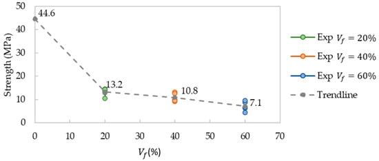 The tensile tests under off-axis loading were performed at an angle of 45° relative to the fiber in the SFRC specimens with fiber-volume fractions of 20%, 40% and 60%. All tested samples, regardless of the percentage of fiber content, had the same fracture form—a diagonal line at 45° along the fiber (Figure 7d). The effective modulus of elasticity for the SFRC with 20%, 40% and 60% fiber-volume fractions and the fiber direction in 45° to the load are 2.5 ± 0.29 GPa, 2.3 ± 0.30 GPa and 2.1 ± 0.20 GPa, respectively; the effective tensile strengths of the SFRC are 13.2 ± 1.5 MPa, 10.8 ± 1.7 MPa and 7.1 ± 1.8 MPa, respectively (Figure 9). It is important to note that the effective tensile strength is small (much smaller than the critical stress for the matrix); the low fiber-matrix bonding strength, as well as low transverse strength of the fiber itself, can be the cause of the observed fracture.