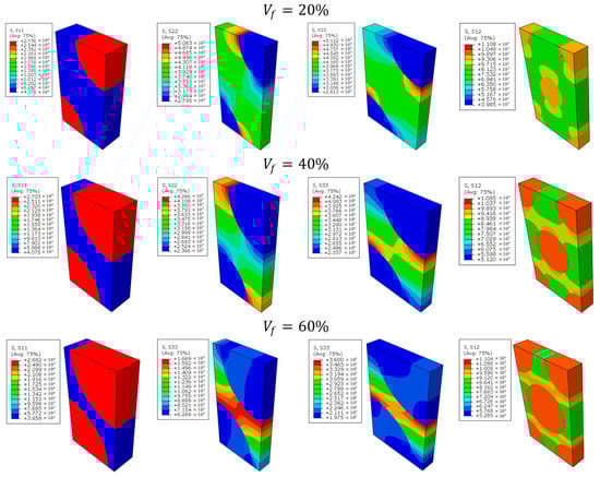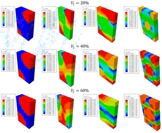 Calculation of the components of the stiffness matrix is carried out according to Equation (2), based on the output data at an element integration point of the stresses in different directions (S11, S22, S33, S12, S13, S23 in ABAQUS) and local volume (IVOL in ABAQUS). The effective properties of the lamina are calculated based on the obtained components of the stiffness matrix according to Equation (3). For illustration, the output of the stresses for fiber defined as isotropic is shown in Figure 10, and as anisotropic is shown in Figure 11, for fiber-volume fractions of 20%, 40% and 60% in both cases. The stresses in the direction of the unit strains (Section 2.3) are shown. The transverse stiffness of an isotropic fiber is higher than the stiffness of the matrix, while the transverse stiffness of an anisotropic fiber is less than the stiffness of the matrix; accordingly, there is a difference in the stress distribution in the RVE models.
