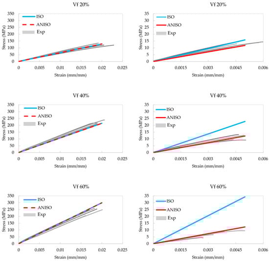 The effective parameters of composites, obtained in Section 3.2, are introduced into numerical models of the tensile tests, built in the ABAQUS software, according to the description in Section 2.4. The analysis is carried out on 12 models: 6 for axial and 6 for off-axial loading, for different fiber-volume fractions of 20%, 40% and 60%. The results of the analysis are shown in relation to the corresponding experiments in Figure 12: for axial load in the left column and for off-axis loading at 45° to the fiber orientation in the right column.