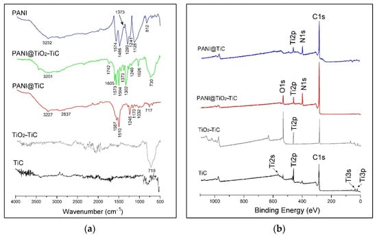 Figure 1a shows the FTIR analysis of the TiC, TiO2–TiC, PANI, PANI@TiC and PANI@TiO2–TiC samples. The absence of any significant bands in the TiC spectra suggests the chemical inertness of this material [27]. Meanwhile, the TiO2–TiC composite spectrum showed a strong absorption band at 719 cm−1, demonstrating a Ti–O–Ti bond in this new composite [28]. Moreover, the IR spectra of PANI show the principal characteristic peaks of the samples at 1574 cm−1, 1486 cm−1, 1373 cm−1, 1290 cm−1 and 812 cm−1, in line with the findings from literature [14]. The spectrum shows two bands in the region of 1574 cm−1 and 1486 cm−1 belonging to the stretching vibrations of the quinoid (Q) and benzenoid (B) units of polyaniline [14,23]. The band at 1373 cm−1 is due to the C‚ N+ stretching adjacent to the Q structure while a band near 1290 cm−1 can be attributed to C–N stretching vibration in the alternate rings of Q–B–Q units. The two bands at 1373 cm−1 and 1290 cm−1 can be attributed to N–H bending and the symmetric component of the C–C (or C–N) stretching modes. The band at 1241 cm−1 corresponds with the B–(NH+) and Q structure, created during the protonation process. The peak at approximately 1574 cm−1 proves the existence of a protonated imine, and the band at 1290 cm−1 is characteristic of conducting a protonated form of PANI. Finally, the band at 3232 cm−1 corresponds with the N–H stretching frequency. Additionally, all absorption peaks appearing in pure PANI are in the proper position for PANI@TiO2–TiC, but these peaks are slightly shifted toward a higher wavenumber value. Moreover, a new band clearly appeared at 730 cm−1 linked to Ti–O–Ti, suggesting the formation of TiO2 molecules in the studied TiC. In contrast, the FTIR spectra of PANI@TiC display a decrease in the intensity of most bands compared with pure PANI spectra. Additionally, the band at 1373 cm−1 was observed to disappear. Furthermore, the band relating to Q moved to 1567 cm−1, decreasing and becoming broader at the same time.