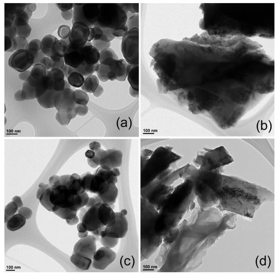 Transmission electron microscopy (TEM) images of: (a) TiC; (b) PANI@TiC; (c) TiO2–TiC; and (d) PANI@TiO2–TiC.