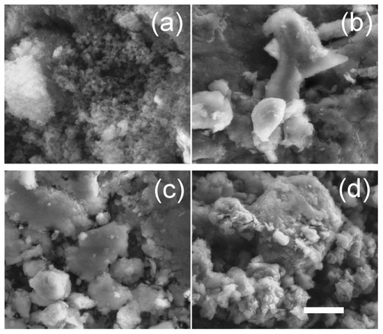 Scanning electron microscope (SEM) images of: (a) TiC; (b) PANI@TiC; (c) TiO2–TiC; and (d) PANI@TiO2–TiC. Scale bar indicates 5 µm.
