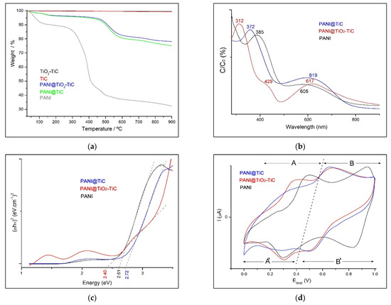 The UV–visible absorption spectra of the prepared materials are compared in Figure 7b where these materials were dissolved in THF. Both the graph of pure PANI and that of PANI@TiC show two bands at 372–385 nm and 605–619 nm assigned to transition B and Q, respectively, which is consistent with the molecular structure of the emeraldine base form. The first identified absorption band can be attributed to the π–π* transition in the B unit. The second absorption band is assigned to the transition Q unit (charge transfer from HOMO of the B unit to LUMO of the Q unit) [38]. These bands provide information on the general oxidation state of PANI. Conversely, we can clearly observe the characteristic bands of the PANI@TiO2–TiC sample at approximately 312 nm and a broad band with a maximum at approximately 617 nm, which relates to the electronic transition of polaronic species and emeraldine salt, respectively. In addition, this spectrum showed a new absorption band at approximately 429 nm, probably due to the presence of TiO2 in PANI@TiO2–TiC.