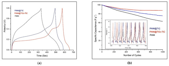 Cycling stability (CS) is a critical factor for operational supercapacitors. Particularly, polymer-based supercapacitors frequently experience limited CS due to the polymer shrinking and swelling during its GCD process [16]. Figure 8b displays the samples’ CS performance at the current density of 1.5 A·g−1. We found that the capacitance retention of PANI is quickly fading with a growing number of cycles achieving 64.4% after 1500 cycles (Figure 8b [43]. Furthermore, the capacitance retention of PANI@TiO2–TiC (88.2%) is higher than that of PANI@TiC (76.8%), showing the beneficial impact of TiO2. In other words, the presence of the TiO2 in TiO2–TiC composite can play a key role in the enhancement of PANI’s electrochemical performance, suggesting the good cycling performance of the device, demonstrating its great application potential for energy storage systems.