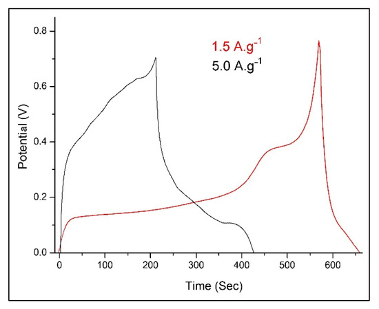 Figure 9 compares the GCD patterns of PANI@TiO2–TiC at current densities of 1.5 and 5.0 A·g−1. The specific capacitance Csp (F·g−1) from the electrode setup was calculated from CV and GCD by Equations (2) and (3):