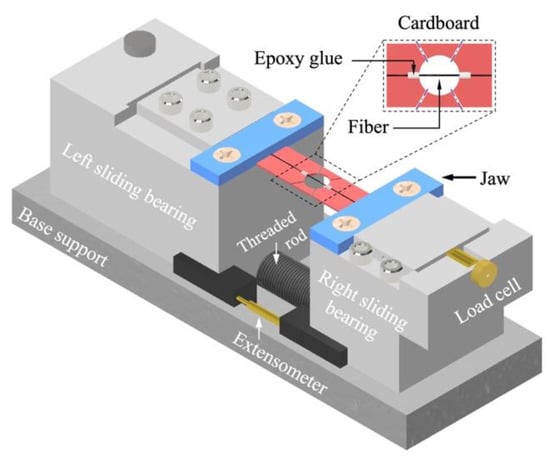 Tensile experiments on single fibers were performed using a Deben microtest tensile stage (Deben UK Ltd., Oxford, UK). Figure 2 is the schematic of the loading platform, containing a threaded rod, left and right jaws supported on stainless steel sliding bearings, an extensometer, and a load cell. Prior to an experiment, a fiber specimen was first cured on cardboard by using DP190 epoxy glue (3M Inc., ST. Paul, MN, USA), spanning a 6.35-mm-diameter circle. The cardboard was then clamped down to the left and right jaws and cut along the dashed lines in Figure 2. During the tensile experiment, the threaded rod was driven by a step motor and controlled the left and right sliding bearings to move apart. The tensile force was applied to the fiber specimen by a displacement-controlled mode at a calibrated rate of 1.67 µm/s. The displacement (Ste) was recorded by the extensometer with a recording rate of 1 s−1, and the force (Fte) was measured by the load cell assembled behind the jaw on the right sliding bearing. The data were then reduced to the stress and strain history of the specimen by