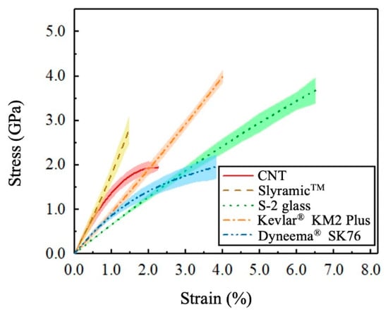 The three inorganic fibers are namely CNT, SlyramicTM, and S-2 glass fibers. As a carbon-based high-performance fiber, except for the excellent conductivity and high strength-to-weight ratio [20,21], CNT fibers are bendable and knittable [22]. Therefore, they are regarded as promising materials for wearable electronics [23] and composites [24]. In this work, single long CNT fibers were purchased from DexMat (Houston, TX, USA), manufactured by using a downscaling solution processing method mentioned in [25]. SlyramicTM fibers, made by COI Ceramics, Inc., San Diego, CA, USA, are a kind of ceramic fibers that have extradentary temperature creep resistance [26]. These fibers are the desirable ceramic-matrix composite (CMC) reinforcement used in aircraft and land-based turbine engines [27]. They may also find utility in other areas such as nuclear power, conventional power generation, and waste incineration [26]. With superior strength and elongation, impact, and corrosion resistance, S-2 glass fibers are the critical componential materials of vehicle armors and marine vessels [27,28]. The single glass fiber specimens were extracted from the S-2 glass roving provided by AGY, Aiken, SC, USA.
