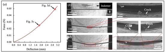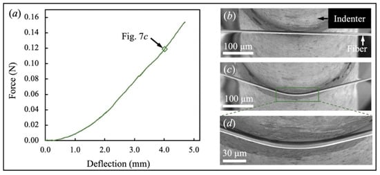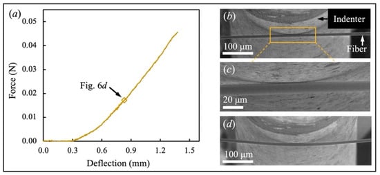 A single SlyramicTM ceramic fiber’s failure under transverse loading by the indenter was in a brittle manner. As shown in Figure 6, the representative SlyramicTM fiber failed when the deflection was only 1.382 mm. Presumably due to the high hardness and modulus of the ceramic fiber [35], the fiber did not have observable transverse deformation. Merely a small bending deformation was captured in Figure 6d before the fiber fractured.