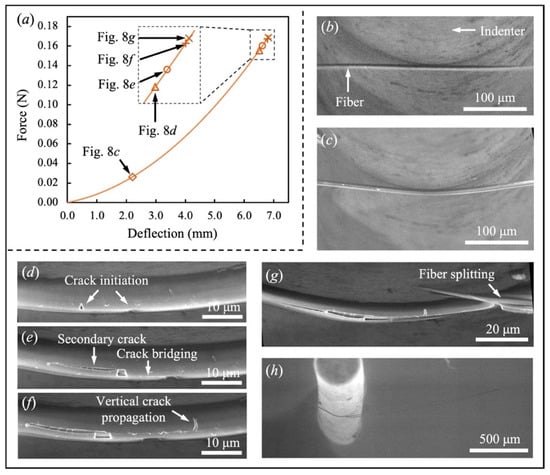 Failure processes of the organic fibers are more complicated than the inorganic fibers. Figure 8 presents a representative Kevlar® KM2 Plus fiber’s failure and the force-deflection curve. The fiber was fixed at two ends and transversely loaded by the indenter at the middle point in Figure 8b. Being softer in the transverse direction, the fiber was bent and simultaneously locally compressed at the fiber/indenter contacting area in Figure 8c. The increasing global bending and local compression inversely enlarged the fiber/indenter contacting area, resulting in a growing fiber/indenter interaction. The fiber became stiffer during loading, revealed by an increasing slope of the force-deflection curve in Figure 8a. When the deflection Str increased to 6.511 mm, we observed two cracks initiating at the bottom of the fiber with a spacing of ~10 μm. As the indenter continued to load the fiber, the tensile stress in the fiber accumulated and the two vertical cracks opened. At the time when Str = 6.621 mm in Figure 8e, the two cracks bridged with each other through a new crack along the fiber’s length. This indicates the transverse debonding of the nanoscale fibrils inside the fiber. Afterward, the two vertical cracks propagated upwards to the indenter. The stress concentration at the crack tip could induce a secondary crack, splitting the fiber in Figure 8f. The fiber’s failure started with the bottom fiber separating from the entire structure after the horizontal cracks propagated along the fiber length to a certain distance. Figure 8g is a close image of the fiber under the indenter, while Figure 8h shows the fiber’s morphology in a larger view. The effective cross section of the fiber then decreased dramatically, resulting in the rapid growth of the tensile stress in the residual fiber. Finally, the fiber could not resist the high tensile stress and failed abruptly in tension.