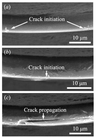 It is noted that defects may not be evenly distributed in the Kevlar® KM2 Plus fiber. The cracks might occur in many places with different numbers. As observed in Figure 9a, two vertical cracks were initiated with a large interval up to 40 μm. In Figure 9b, only one vertical crack was seen during loading. The only difference in failure between these fibers and that in Figure 8 is that the crack’s development did not interact. During the propagation of the vertical cracks, the secondary cracks in the horizontal direction were also generated and split the fiber.