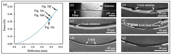 The deformation of the Dyneema® SK76 fiber at the beginning of the loading was similar to the Kevlar® KM2 Plus fiber. The fiber also experienced bending and transverse compression under the indenter. The major difference is the crack initiation and propagation. As presented in Figure 10c,d, the microfibrils on the top of the Dyneema® SK76 fiber fractured at Str = 7.521 mm, resulting in the crack initiation. The cracks opened at the original sites and fractured the fiber from top to bottom (see Figure 10e–g). No secondary cracks were being generated, splitting the Dyneema® SK76 fiber during loading. At the moment just before the fiber’s failure, many kink bands appeared at the fiber/indenter contact area in Figure 10f, presumably due to the unloading process during crack propagation. The force-deflection curve is shown in Figure 10a.