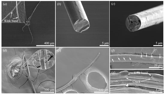 Fracture surfaces of different fibers. (a) CNT fiber; (b) SlyramicTM ceramic fiber; (c) S-2 glass fiber; (d) Kevlar® KM2 Plus fiber; (e–g) Dyneema® SK76 fiber.