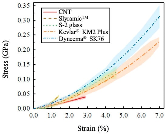 High-performance fibers are well-recognized for their high strength and stiffness. This section compared the tensile stress–strain curves of five fiber types at the loading rate of 2.6 × 10−4. For each fiber type, we first obtained the averaged stress–strain curve by curve-fitting the collected stress and strain history of all the 6–10 specimens. Afterward, a total number of 12 points were selected on the averaged curve to determine the standard deviation. Finally, the upper and lower boundaries at each point were determined to get the error band. As shown in Figure 4, S-2 glass fibers have the maximum failure strain, followed by the two organic fibers, Kevlar® KM2 Plus and Dyneema® SK76 fibers. The organic CNT and SlyramicTM ceramic fibers failed in a small elongation. Among the five fiber types, Kevlar® KM2 Plus and S-2 glass fibers are the strongest. CNT fibers are the weakest. The SlyramicTM ceramic fibers had higher average strength than the Dyneema® SK76 fibers. The S-2 glass, SlyramicTM, and Kevlar® KM2 Plus fibers all had an approximately linear stress–strain relation, while the constitutive relation of CNT and Dyneema® SK76 fibers were non-linear. The density and average diameter, tensile strength, and failure strain of the five fibers were summarized in Table 1.