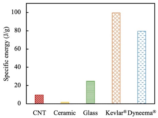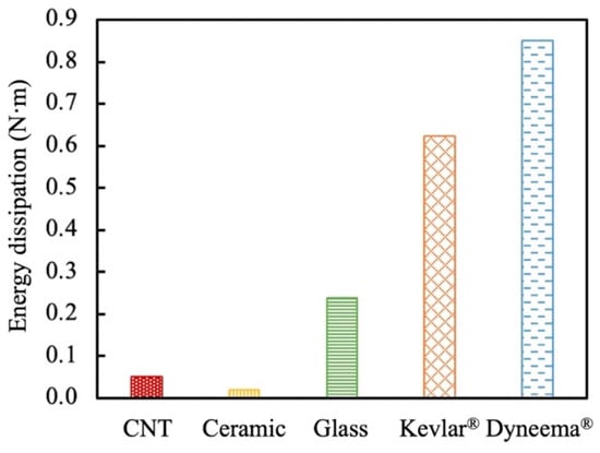 where the density (ρ) and diameter (d) of different fibers are obtained from Table 1. As demonstrated in Figure 15, all the inorganic fibers had a lower energy dissipation per unit mass than the organic fibers. Besides, although the Dyneema® SK76 fiber specimens have the lowest density and dissipated 37% more energy than the Kevlar® KM2 Plus fiber specimens, they possessed a larger diameter. The specific energy of the Dyneema® SK76 fiber was 25% lower than the Kevlar® KM2 Plus fiber.