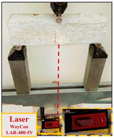 Three-point bending tests were performed to evaluate the flexural and compressive strength of the CFs reinforced pastes. The 40 × 40 × 160 mm prismatic specimens were tested in three-point bending at the age of 7, 14, and 28 days as shown in Figure 2. The tests were conducted with a 25 kN MTS servo-hydraulic, closed-loop testing machine under displacement controls. The rate of displacement remained at 0.1 mm/min. The deflection was measured using a laser meter (WayCon LAR-400-5V) to measure the vertical deformation of the specimen’s middle-length lower side. After the aforementioned process, the two halves of each prism were subjected to a compression test according to the ASTM C349. The test was carried out using a 2000 kN testing machine under force control. The rate of displacement was maintained at 0.5 N/min.