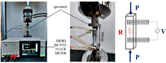 In order to examine the strain sensing ability and the piezoresistive behavior of the cement paste composites at the age of 28 days, the aforementioned 2-pole approach was applied, whilst a hydraulic testing machine MTS with a 25 kN capacity was used for the simultaneous implementation of the specimen’s cyclic or monotonic uniaxial compressive loading. The cyclic compressive load of a maximum of 3 kN (load within the limits of the elastic region, that the value of the stress is approximately 7.5 MPa) was applied in each sample, with each cycle of loading–unloading lasting about 120 s, while the monotonic compressive loading was performed up to specimen’s failure with a loading rate of 0.005 mm/min. The values of load and resistance were recorded every 5 s. The test setup is represented in Figure 3.