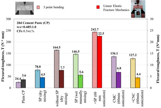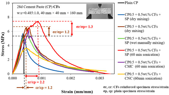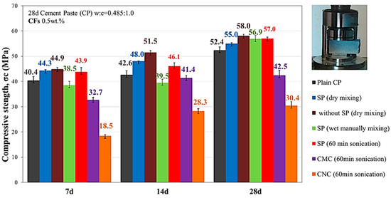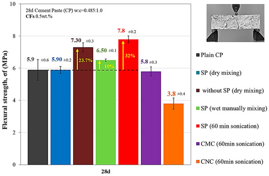 - The compressive strength increased by 10.4% with the method of dry mixing without SP, while with the wet method of SP addition and simple agitation with a manual stirrer by 8.6%. The flexural strength increased by 32% with the wet method of adding SP using 60 min sonication and by 24% with the method of dry mixing of CFs without SP.