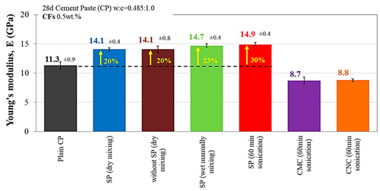 Young’s Modulus of 28-day plain cement pastes and CFs reinforced cementitious composites.