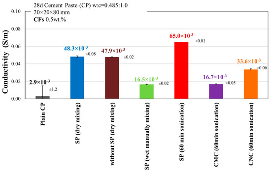 The average conductivity measurements derived from the experimental resistance measurements of the 28-day plain and reinforced cement pastes with CFs at volume fractions of 0.5 wt.% are presented in Figure 8. The addition of CFs incorporated by dry mixing resulted in an almost 17 times higher conductivity value compared to plain cement paste. An even higher increase in conductivity, by 96%, is achieved in the case of introducing the CFs dispersed by the ultrasonication process. This can be attributed to the adequate distribution of CFs in the cement-paste matrix, resulting in a continuous electrical network that allows the current to pass more easily.