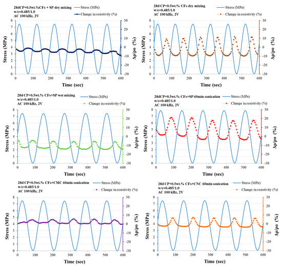 In view of the similarity in the piezoresistive effect curves of the specimens by the different mixing methods, the piezoresistive curves of the CF-reinforced specimens with added SP and sonication and with dry mixing present an optimistic piezoresistive response.