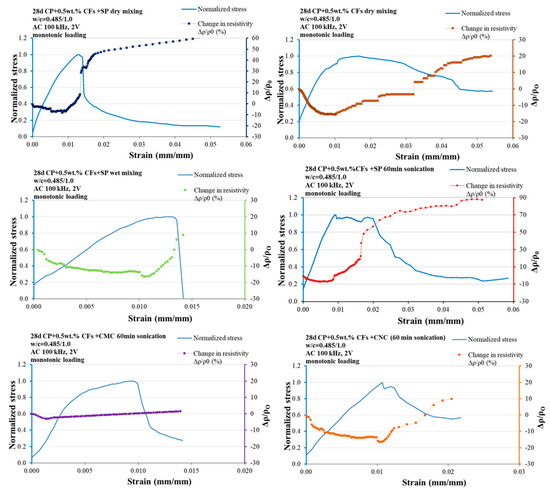 For more study of the effect of the incorporation CF on the self-sensing and crack detection ability of the reinforced cement pastes, additional piezoresistivity experiments were conducted, with the simultaneous application of monotonic compressive loading up to failure. At first glance of the combination of stress–strain and average change in resistivity–strain curves (Figure 9 and Figure 10), all of the reinforced specimens exhibited a great ability to perceive the change in the applied stresses, the induced mechanical deformation, and the formation of the cracks. Therefore, they can be considered piezoresistive sensors.