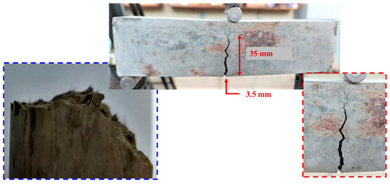 From the photographs and the crack width measurements represented in Figure 12, it can be pointed out that the crack width of the cement specimen after the bending test, with the method case of wet mixing of CFs adding SP and using 60 min sonication, is 3.5 mm and the length is 35 mm. The CF concentration is shown at the rupture interface, where masses of agglomerates are not observed in the cement volume, and the microfibers are distinguished, which bridge the micro and macro cracks, increasing the post-peak behavior of composite materials. This fact leads to an increase in the length of the failure area around the edge of the crack, thus reducing its brittle behavior and increasing the energy absorption capability.