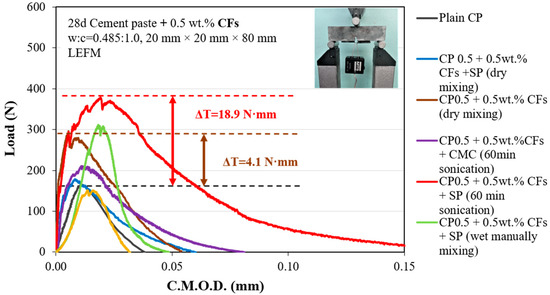 Load–CMOD curves of 28-day plain and CFs composite cement pastes at volume fractions of 0.5% from LEFM tests of 20 mm × 20 mm × 80 mm specimens.