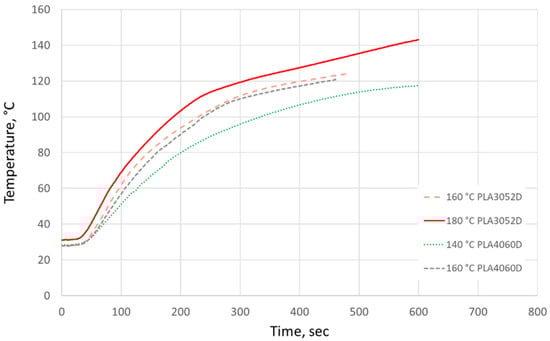 Selected internal panel temperature profiles for 5-ply panels formed at differing pressing temperatures (140 °C, 160 °C and 180 °C) with either semi-crystalline (3052D, purple and red) and amorphous (4060D, blue and green) PLA.